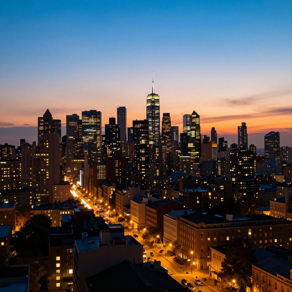 Witness the urban landscape transformed by the twilight glow, with city lights painting the sky in a mesmerizing palette. The photorealistic rendering captures the architectural details, the warm glow of streetlights, and the dynamic energy of a city coming to life as day turns to night.