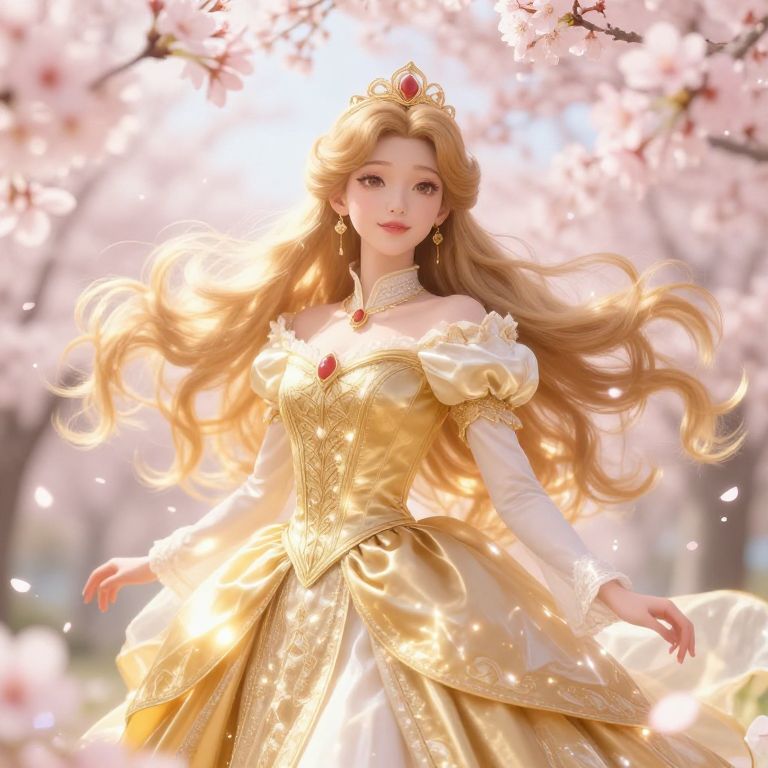 Princess beautiful anime girl with long flowing hair, dressed in ornate royal attire with gold and silk textures, surrounded by cherry blossoms in full bloom, dreamy background with floating petals, magical light effects enhancing her graceful and serene expression.