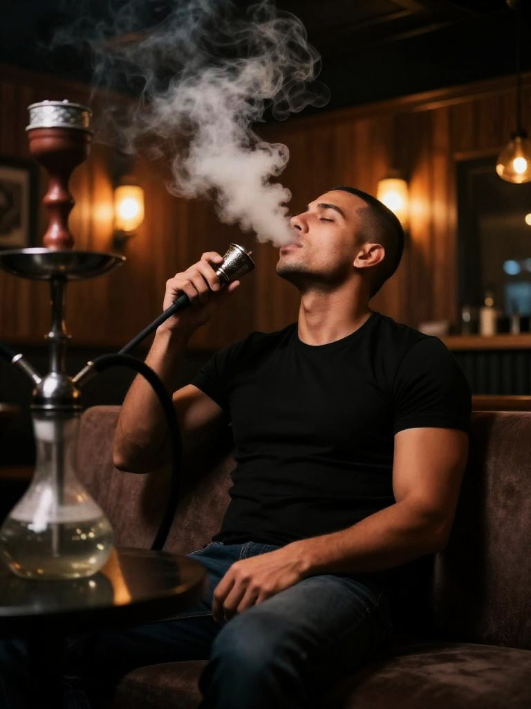 Man smoking shisha, adult man lounging in a stylish hookah bar, clean-shaven man with buzz cut wearing fitted black t-shirt and jeans, leaning back against a sofa with head tilted upward, exhaling a long plume of smoke toward the ceiling, tall dark glass hookah standing on the table beside him, warm cosy lighting with wooden wall panels in the background, moody nightlife atmosphere, realistic photography, high resolution