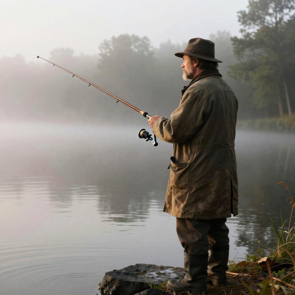 Geezer fishing on a misty lake at dawn, wearing a worn-out coat and hat, with a wooden fishing rod, surrounded by calm water and foggy trees, a quiet and peaceful atmosphere, painterly and atmospheric style.