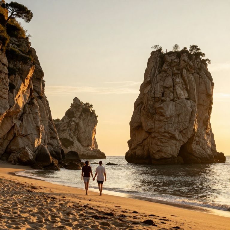 Couple strolling hand-in-hand along the golden sands of Sorrento Coast, framed by three majestic rock formations and the warm glow of the setting sun.