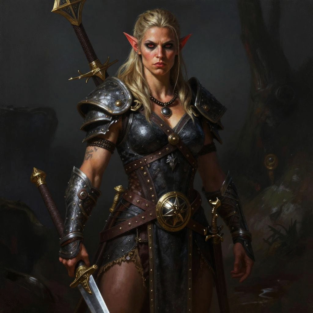 Digital art of a muscular, blonde elf warrior with pointed ears, wearing dark, armored attire, holding a sword, and standing in a dimly lit