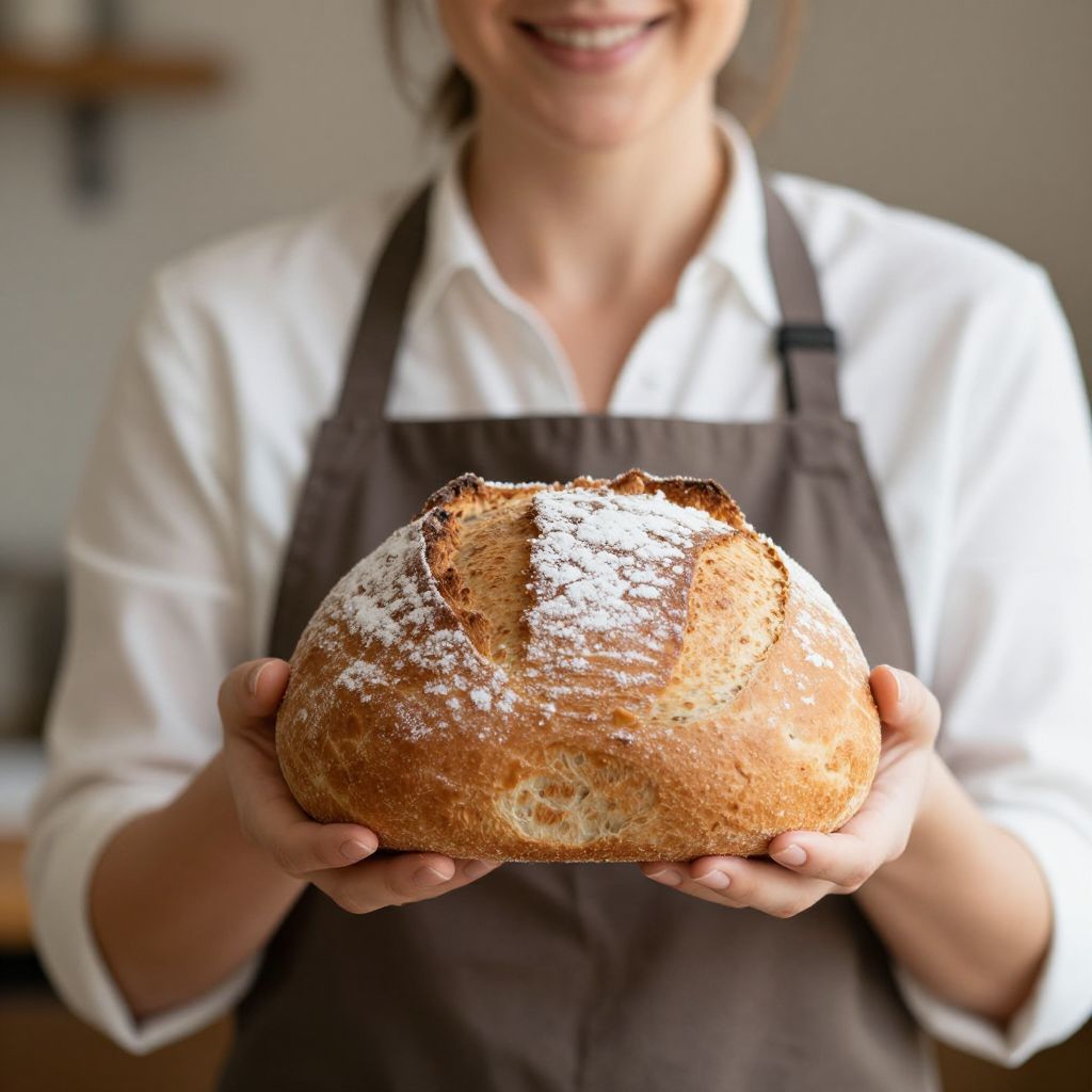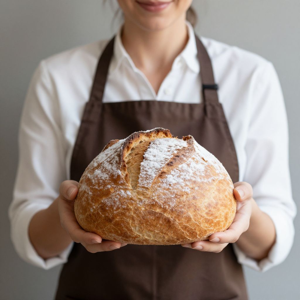 Smiling woman wearing a white shirt and brown apron holds a freshly baked loaf of bread dusted with powdered sugar, showcasing its golden-brown crust and inviting texture.
