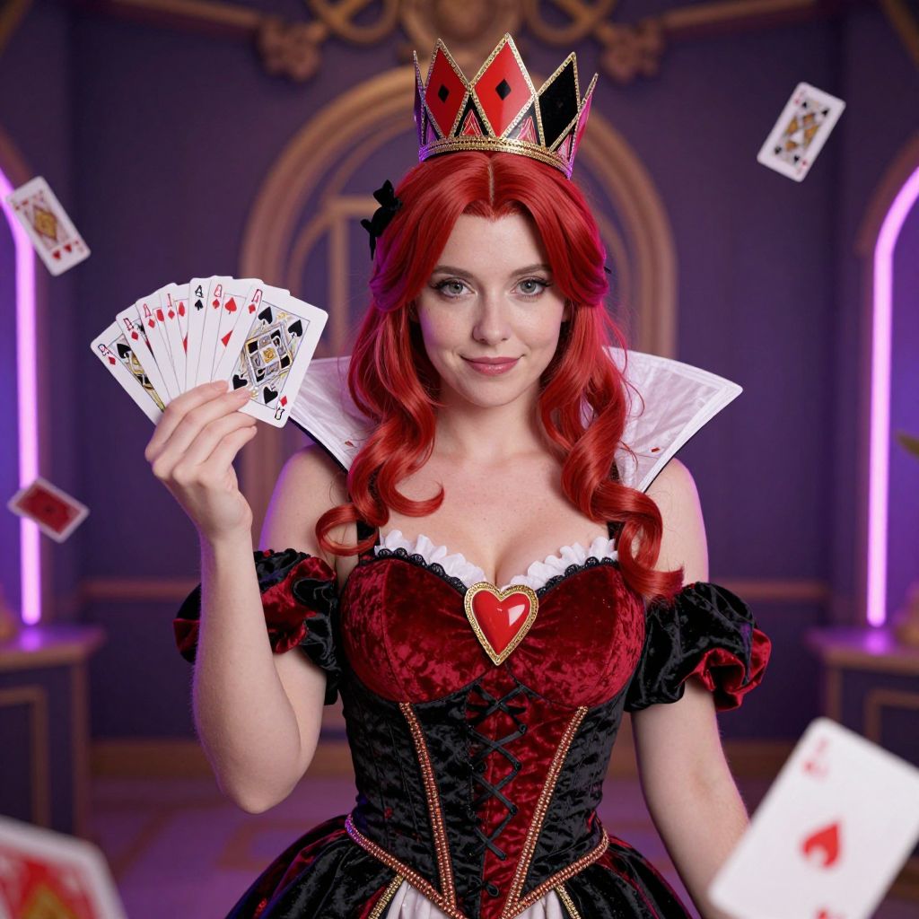 A realistic indoor scene of a woman in a Queen of Hearts costume, wearing a red and black velvet corset with a heart-shaped brooch and a crown made of interlocking red and black playing card pieces, standing in a fantasy-style game room with neon-lit walls and floating decks of cards, her face is fair with soft green eyes and a serene smile, wearing a red wig with black accents, as if she's about to deal a powerful card.. The woman has big tits and cute face