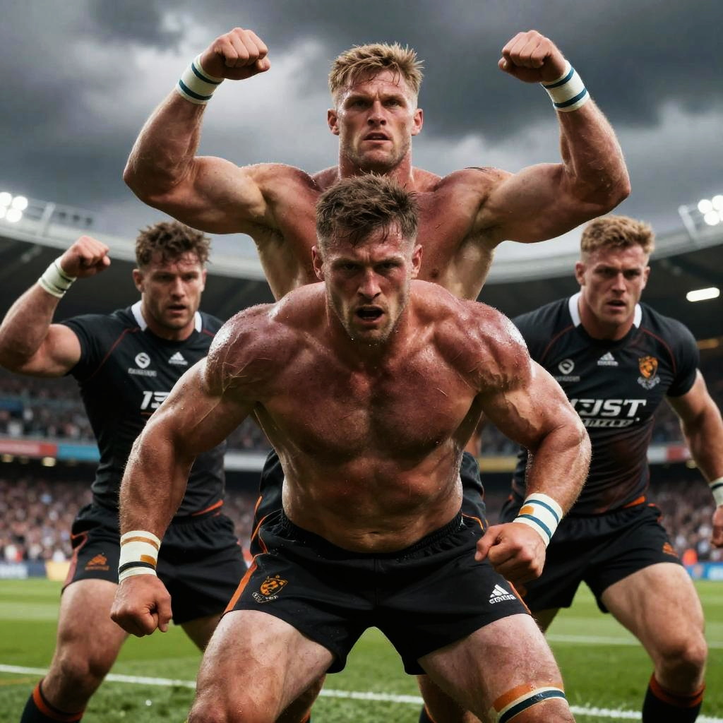 Ripped rugby players in dynamic action, powerful muscles flexing, intense facial expressions, stormy stadium background, high detail, cinematic lighting, hyperrealistic style