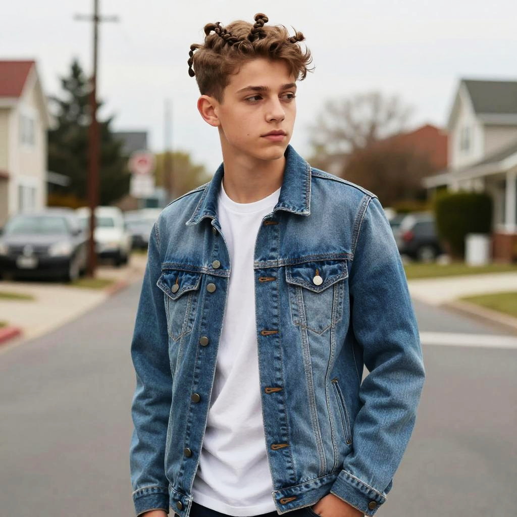 Mini Twists hairstyle on male teenager, wearing slim-fit denim jacket and white tee, in suburban street, captured in fashion editorial style with soft overcast daylight.