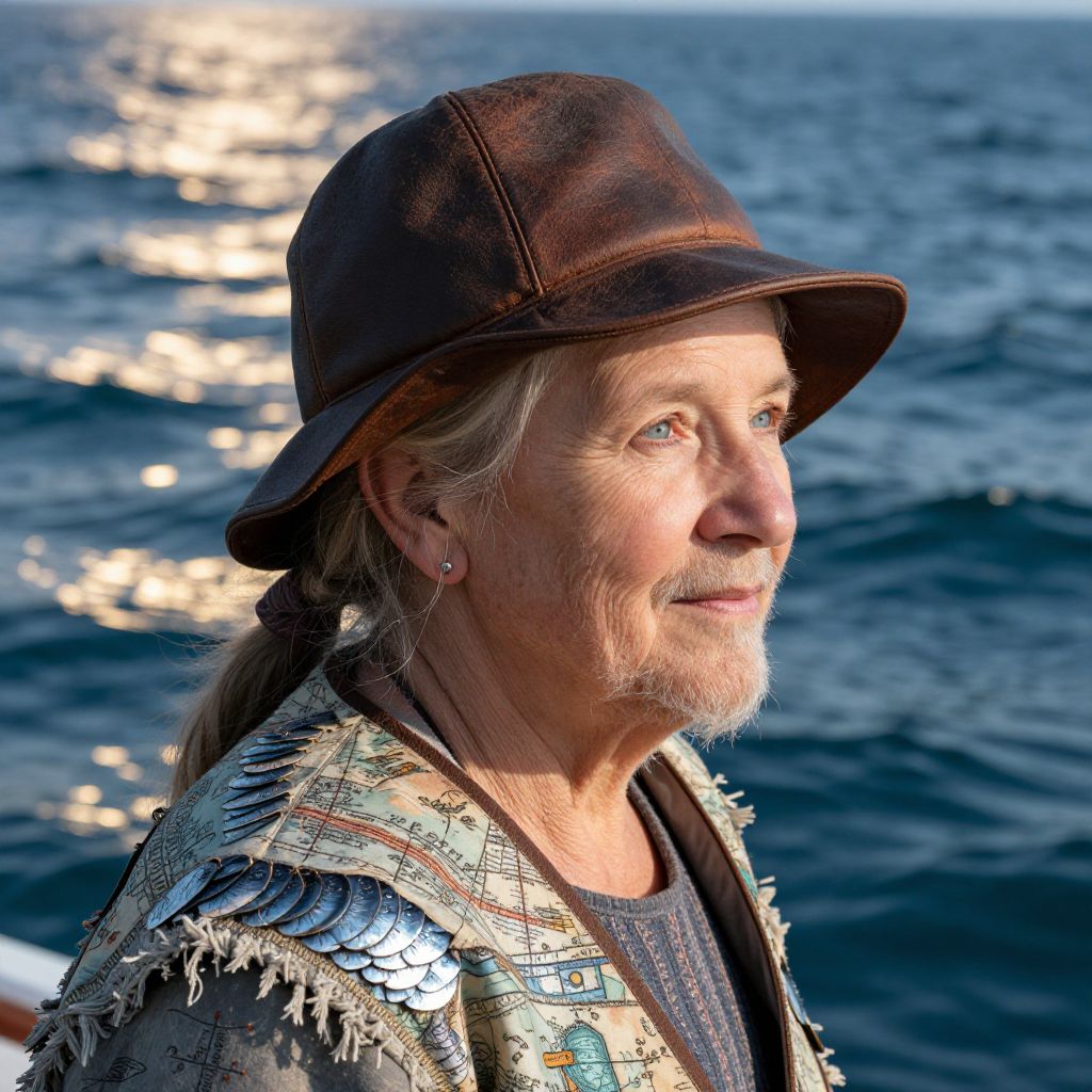 Craft a photorealistic portrait of an elderly girl with a serene expression and compassionate blue eyes beneath a salt-and-pepper beard. Capture her resilience and untold tales in a close-up side view from a 'bug's-eye' perspective. Use vivid yet soft lighting that reflects off the ocean waves behind, casting dancing shadows on her worn leather hat and frayed sleeves. Incorporate surreal elements like fish scales woven into the fabric of her jacket, featuring intricate patterns inspired by ancient maritime maps. Create an image that seamlessly blends realism with fantasy, capturing both her human features and the allure of a life at sea.