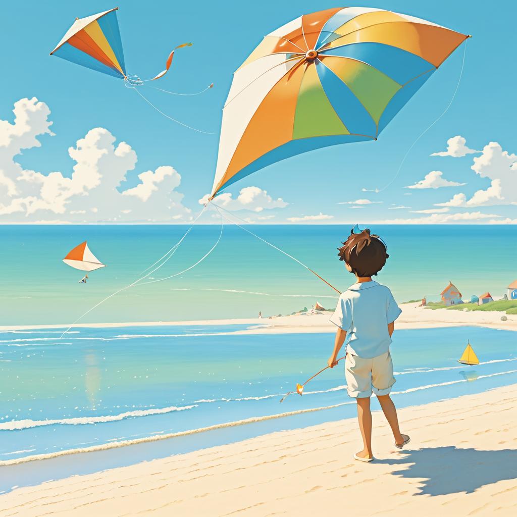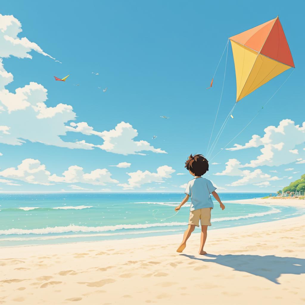 A boy flying a kite on a sunny beach, in a style inspired by Hayao Miyazaki and whimsical, iconic and nostalgic.