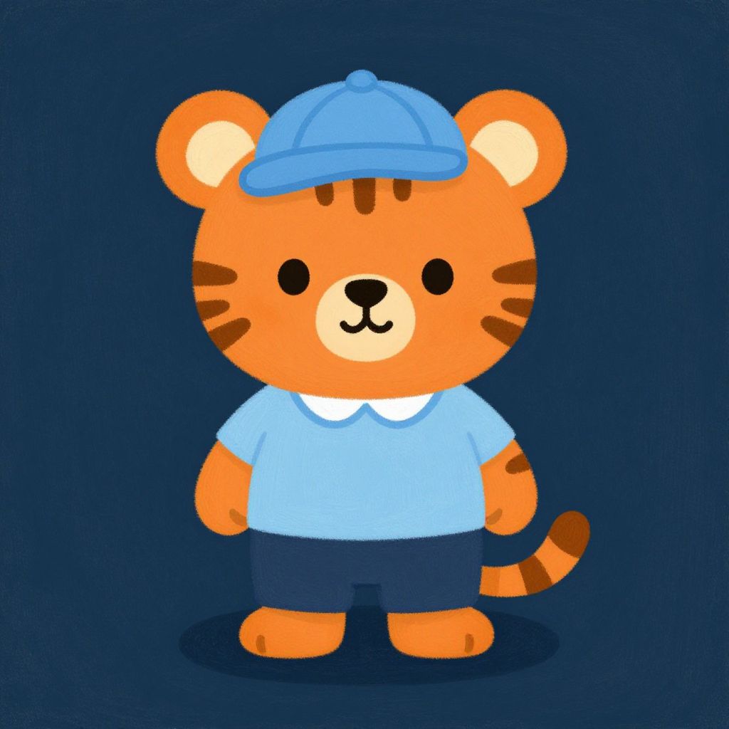 Illustration of a cute little tiger character wearing a light blue shirt with a white collar, navy blue shorts, and a matching blue cap. The character is designed in a children's book illustration style with simple, dark pastel colors and an oil painting texture on a dark blue background.