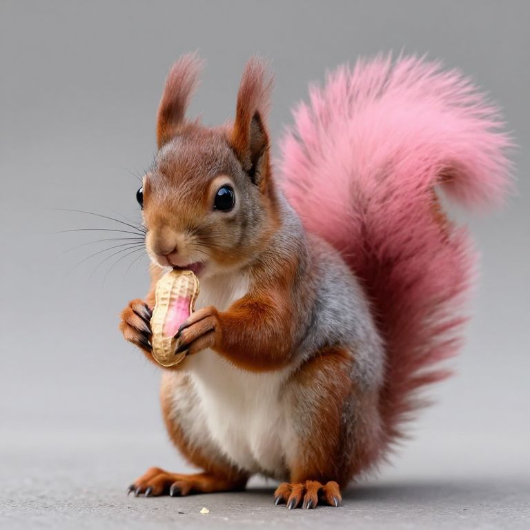 In the image, a cute squirrel with a fluffy pink tail is depicted in a charming and detailed manner. The squirrel, with its soft, brown fur and expressive eyes, is holding a pink peanut in its hands, seemingly in the process of eating it. The peanut is intricately detailed, with a textured surface and a small piece broken off, indicating the squirrel's ongoing consumption. The squirrel's posture is relaxed, with its front paws holding the peanut and its back legs firmly planted on the ground. The background is a simple, neutral gray, which helps to highlight the squirrel and the peanut, making them the focal points of the image. The overall composition is balanced, with the squirrel positioned slightly to the left, creating a sense of depth and perspective. The interplay of colors, textures, and shapes in the image creates a visually appealing and engaging scene.
