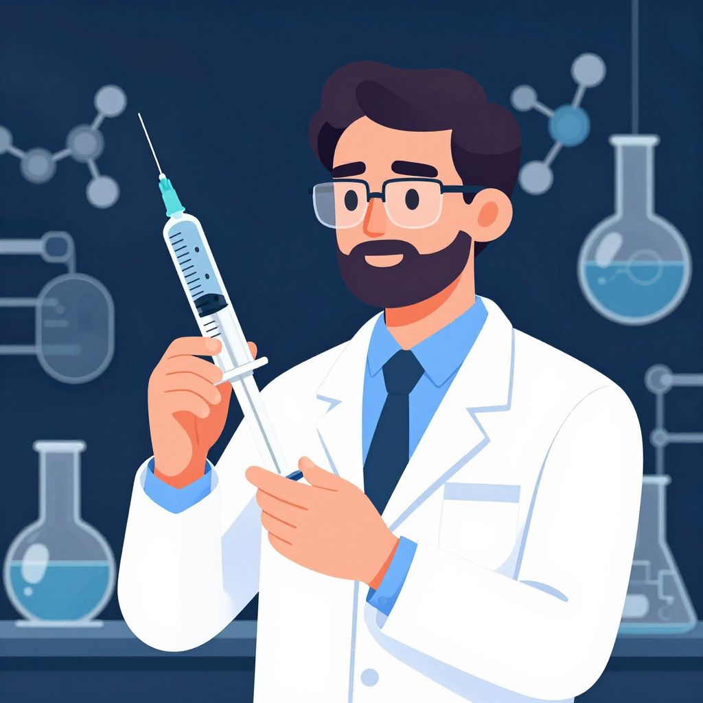 Digital illustration of a modern laboratory with three scientists in white lab coats. A woman with brown hair stands on the left, a man with black hair stands on the right, and another man with black hair sits at a desk in the foreground. The seated man operates a computer displaying a molecular structure with red, blue, and white elements. The lab is brightly lit, featuring a microscope on the left, various colorful beakers and test tubes on the desk and shelves, and a blurred background of scientific equipment. The overall style is clean and colorful with a focus on scientific collaboration.
