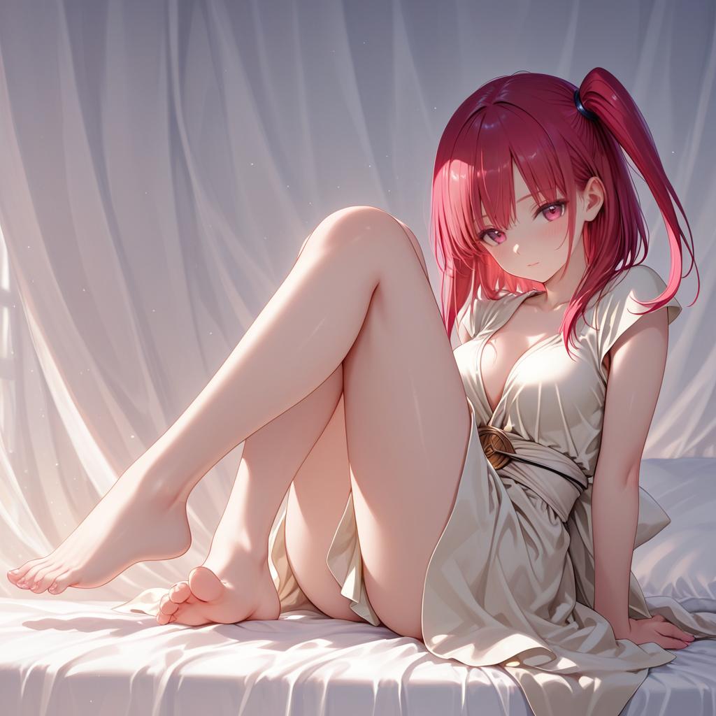 Morgiana, magi the labyrinth of magic, 1girl, red eyes, red hair, long hair, medium breasts, feet, barefoot, one side up, by artist na-ga, dark_illustrious