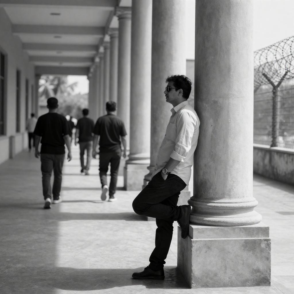Black and white photograph of a man leaning against a stone column in a long colonnade. He has dark hair, wears a light shirt, dark pants, and sunglasses. Several men in dark clothing are walking in the background. Barbed wire fence on the right. Sunlight casts strong shadows.