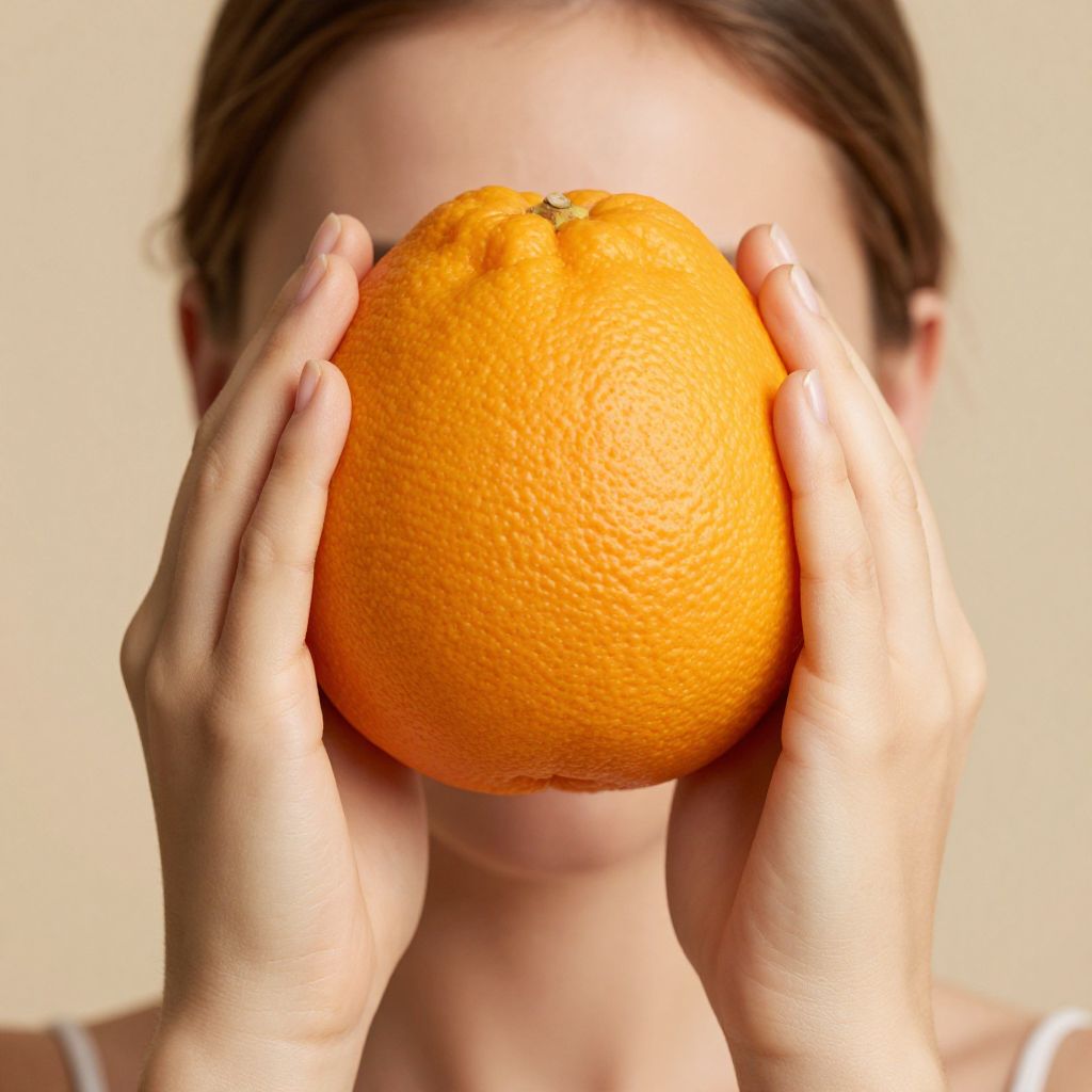 Woman holding a vibrant orange citrus fruit in front of her face, showcasing its textured peel and natural beauty against a warm, neutral background.