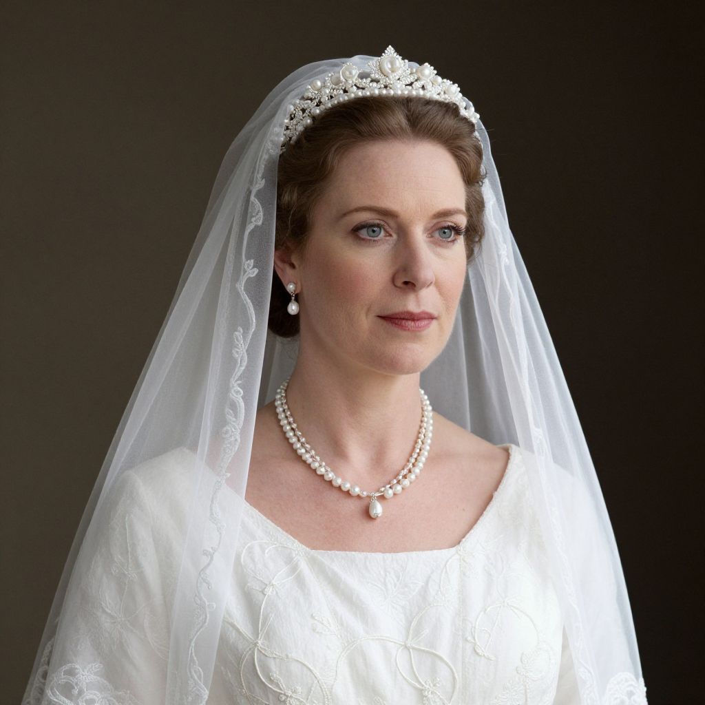 Photograph of a Caucasian woman with fair skin and blue eyes, wearing a white wedding dress with delicate lace patterns. She has her brown hair styled in an elegant updo, adorned with a sparkling tiara and a sheer, lace-trimmed veil that drapes over her shoulders. She wears a double-strand pearl necklace and matching pearl drop earrings. The background is a solid black, making her white dress and accessories stand out. Her expression is calm and composed, with a slight smile. The lighting is soft, highlighting her facial features and the texture of her dress.