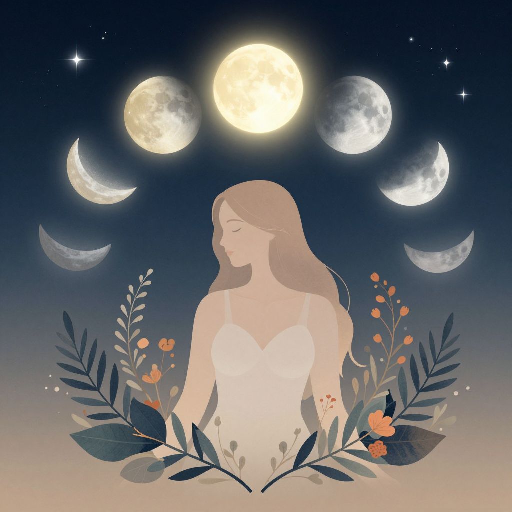 Infographic styled artistic depiction of menstrual phases as different moons in the sky, glowing softly over a gentle female silhouette surrounded by botanical elements, harmonious blend of science and spirituality, elegant and detailed