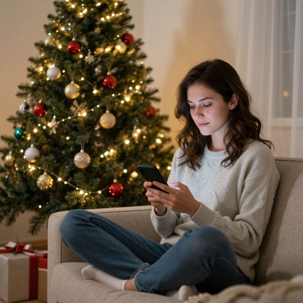 Woman engrossed in her smartphone while seated comfortably in a cozy living room, illuminated by the warm glow of a festively decorated Christmas tree adorned with twinkling lights and vibrant ornaments.