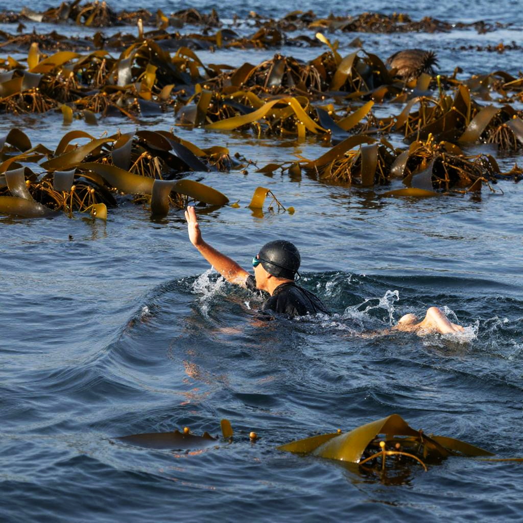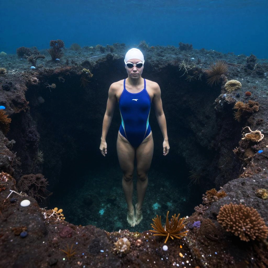 Lone Swimmer Among Giant Sea Turtles