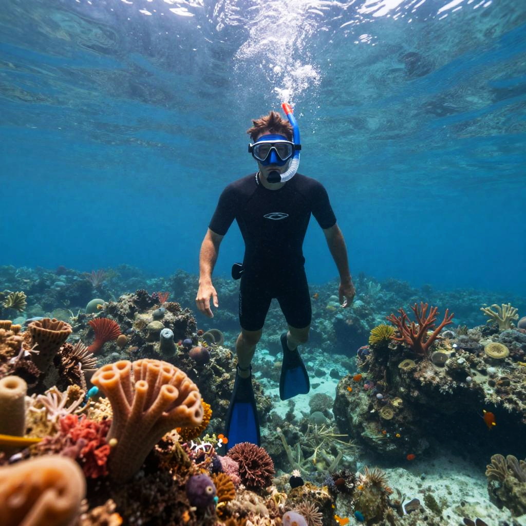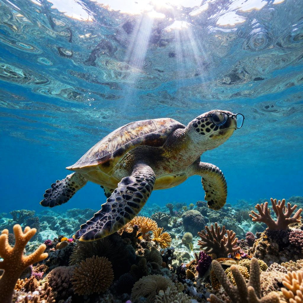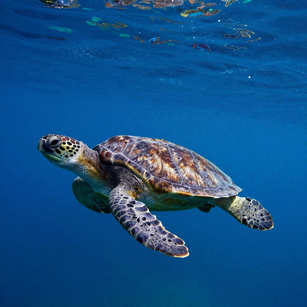 The photograph captures a lone swimmer in the ocean surrounded by giant sea turtles gliding beneath, ultra vibrant shot with an 85mm lens and a shallow depth of field to emphasize the beauty and isolation of the subject. Shot in Super-Resolution and ProPhoto RGB with sharp focus, the image is ultra-realistic, with hyper-realistic textures that enhance the photorealistic detail. The final image is a full-body shot with a cinematic composition.