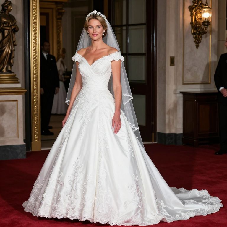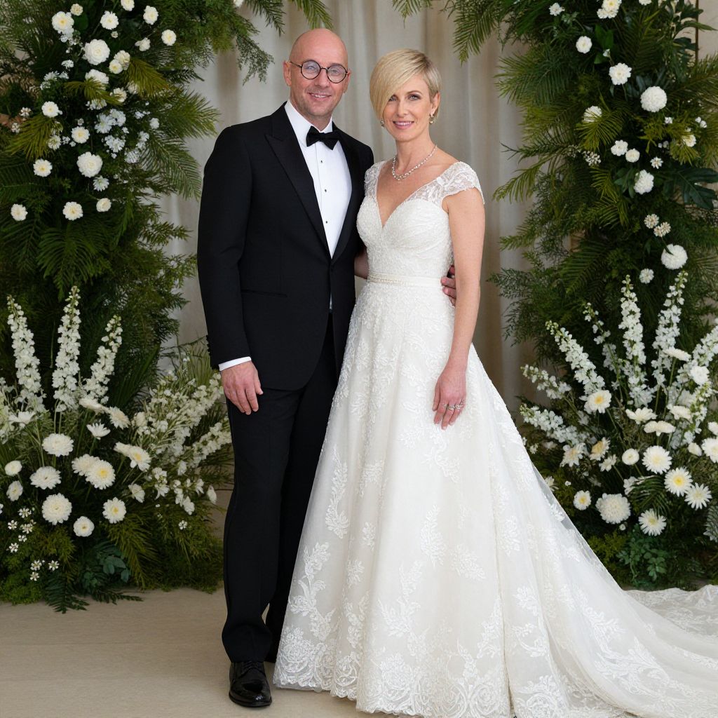 Photograph of a smiling bald man in a black tuxedo with a white dress shirt and black bow tie, standing beside a blonde woman in a white lace wedding dress with a deep V-neck and cap sleeves. They stand in front of a lush, green, floral backdrop adorned with white flowers. The man wears glasses and has his arm around the woman's waist. The woman's hair is styled in an elegant updo, and she wears a delicate necklace. The background features tall greenery and white floral arrangements, creating a romantic and elegant setting.