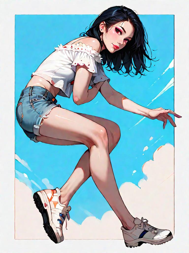 1girl, source_comics, realistic face, full body shot, Woman, casual streetwear, white cropped tank top, spaghetti straps, square neckline, distressed denim knee-length shorts with frayed hems, high waist, plain white backdrop.