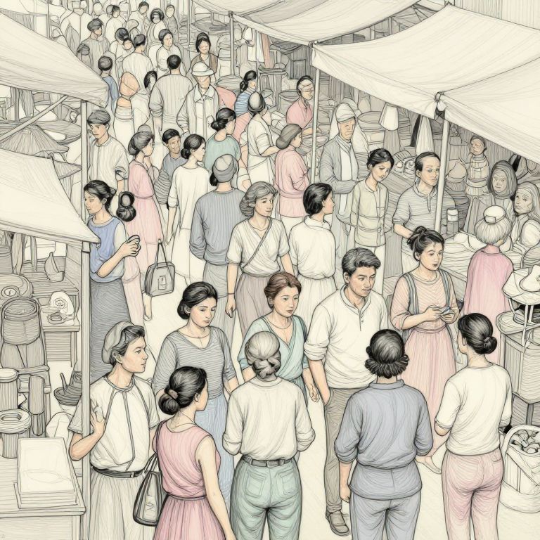 Peopledrawing showcasing a busy marketplace, crowded scene with diverse characters, intricate line work, high-detail clothing and accessories, muted pastel tones, lively interactions and chaos, perspective view from above, artistic blend of realism and impressionism