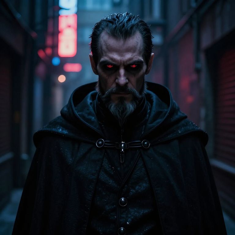 Villain with goatee, dark cloak and piercing eyes, standing in a shadowy alley under flickering neon lights, cinematic atmosphere, high detail, chiaroscuro lighting