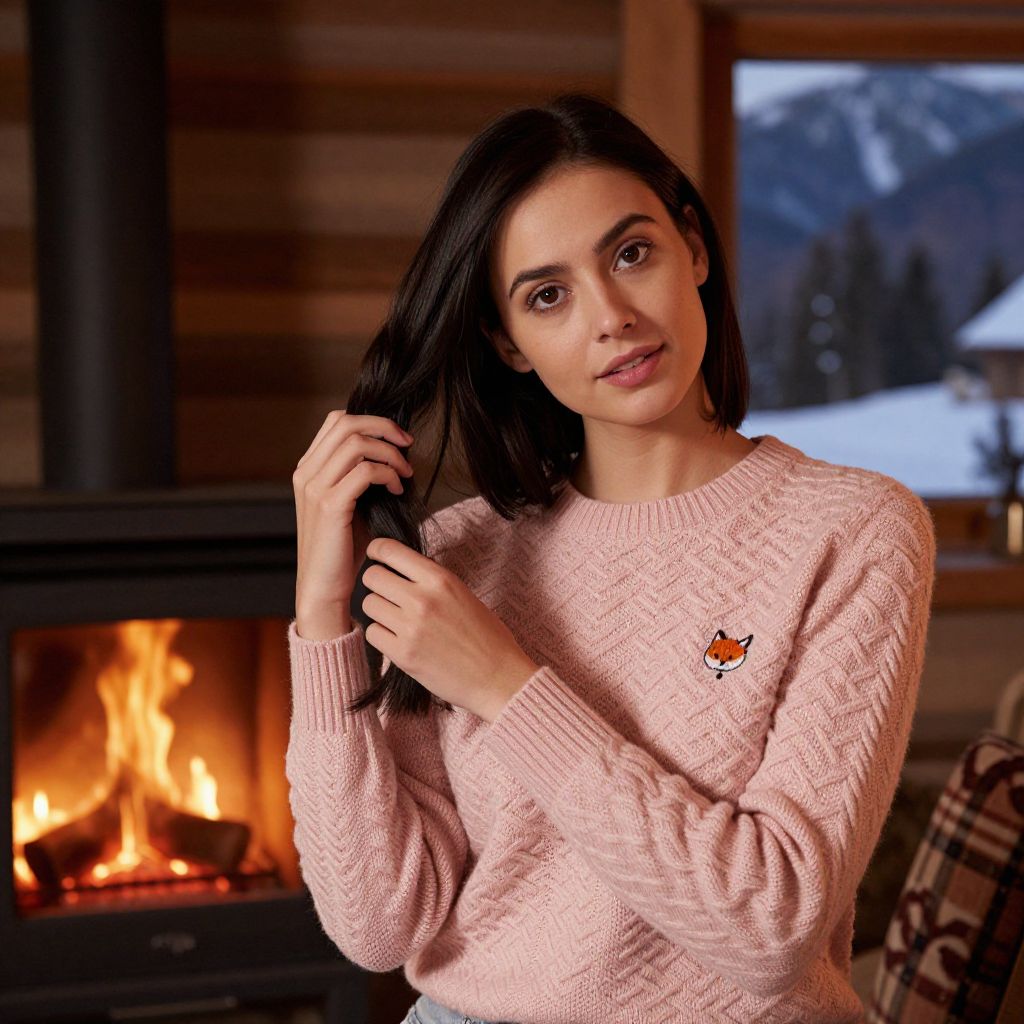 A cozy night scene in a mountain cabin: a woman in her 20s with deep brown eyes and straight dark hair is curling her hair by a wood stove, wearing a gently knit soft pink sweater with a gentle ripple texture and a small embroidered fox design, the cabin warmly lit with a fire crackling in the fireplace behind her.