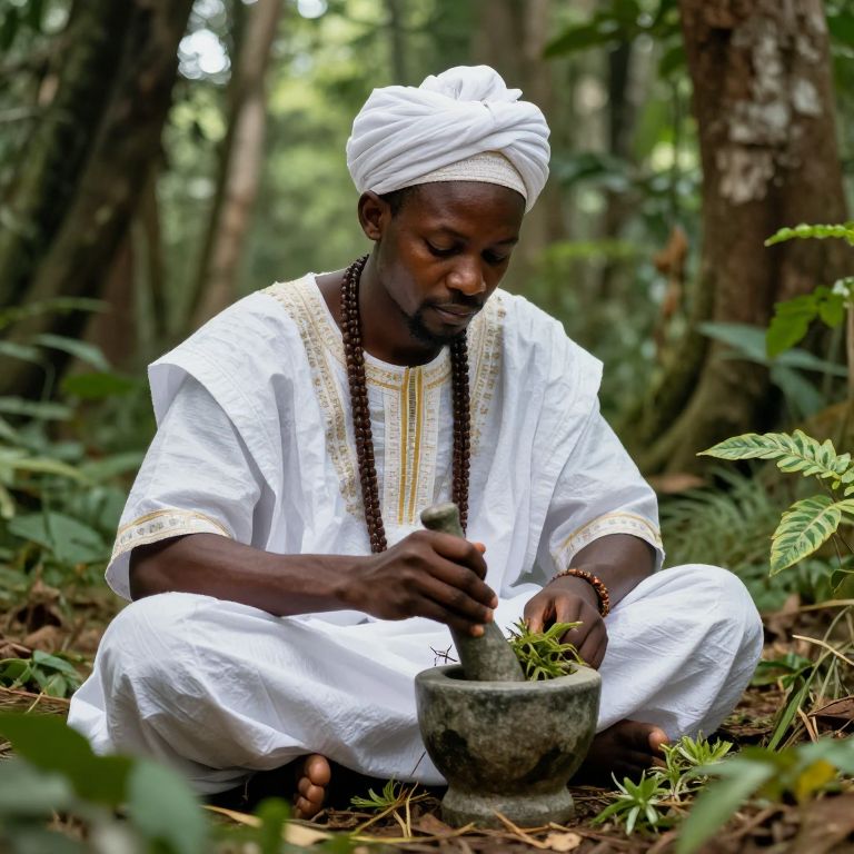 Photograph of a Black man sitting cross-legged on forest floor, wearing a white traditional outfit with gold embroidery and a white turban. He has a dark bead necklace and is grinding a spice in a stone mortar with a pestle. His expression is focused, and the background is lush with green foliage and trees. The man's skin is dark, and the texture of his clothing and beads is visible. The scene is serene and natural, with soft, diffused light filtering through the trees.