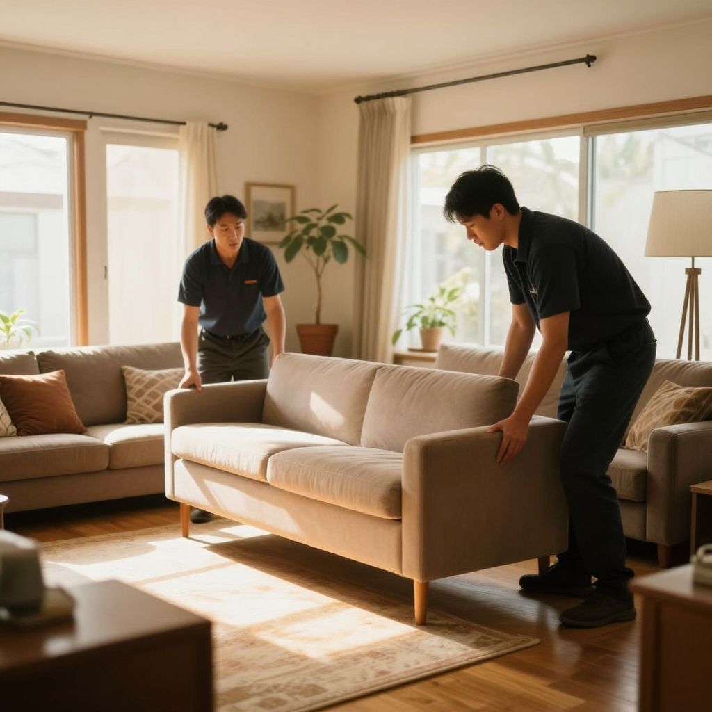 Fast quality moving of furniture through a cozy living room, professional movers handling with care, natural light streaming, warm tones, realistic style