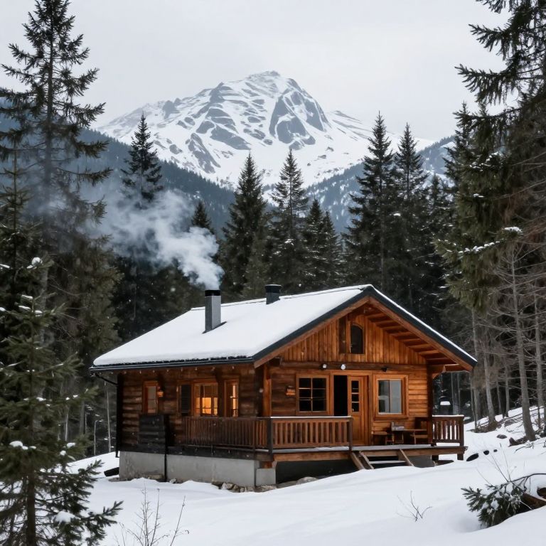 Photograph of a rustic wooden cabin with smoke rising, nestled in a snow-covered forest, with a mountain peak in the background.