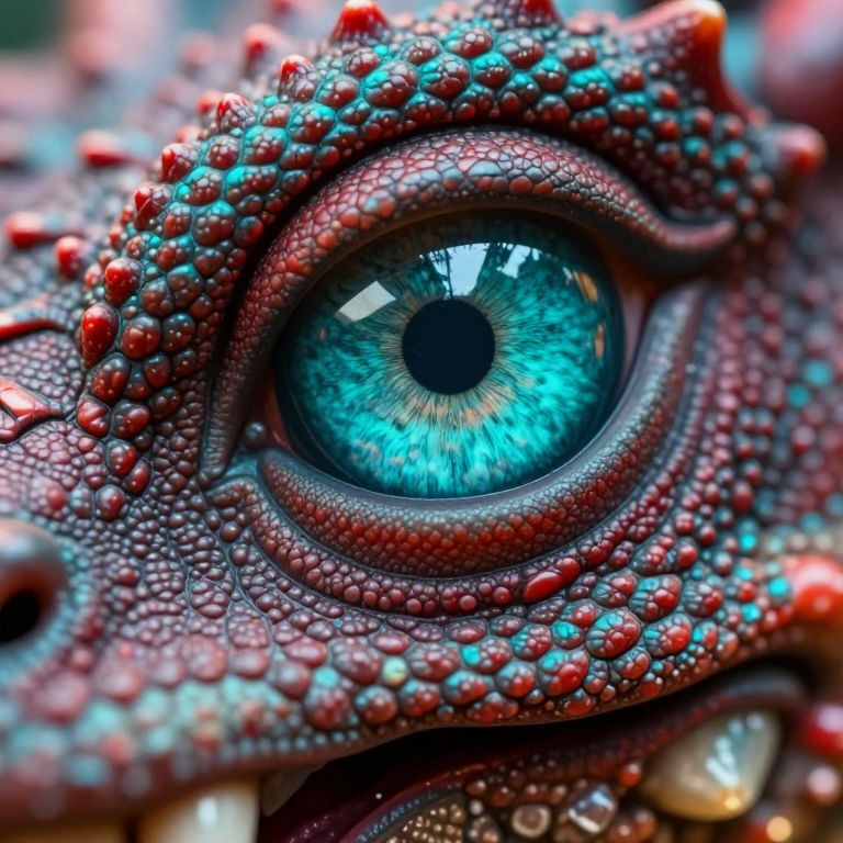 Focus on the textured surface of a dragons eye and slight part of its nose and mouth with teeth visible, capturing the dense network of tiny, repeating dimples that create a fractal-like pattern, Use an ultra macro lens to isolate a small section of the eye, emphasizing the tactile detail of its teal surface, Side lighting enhances the dimensionality of each line, casting subtle shadows across the dragons red scaled skin, Position the camera to balance symmetry and organic randomness, creating a dynamic yet harmonious composition, The vivid teal hue of the eye dominates the frame, with blurred highlights in the background adding a sense of warmth and depth, This close-up transforms an everyday object into a study of micro-scale fractal beauty