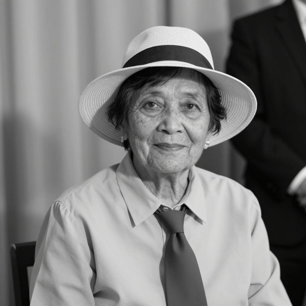 Elderly woman with curly brown hair, glasses, and pearl necklace, wearing a plaid blue dress, holding a pink flower and finger pointing upward. Background: cityscape with illuminated buildings, blue curtains with white floral patterns, and a staircase.