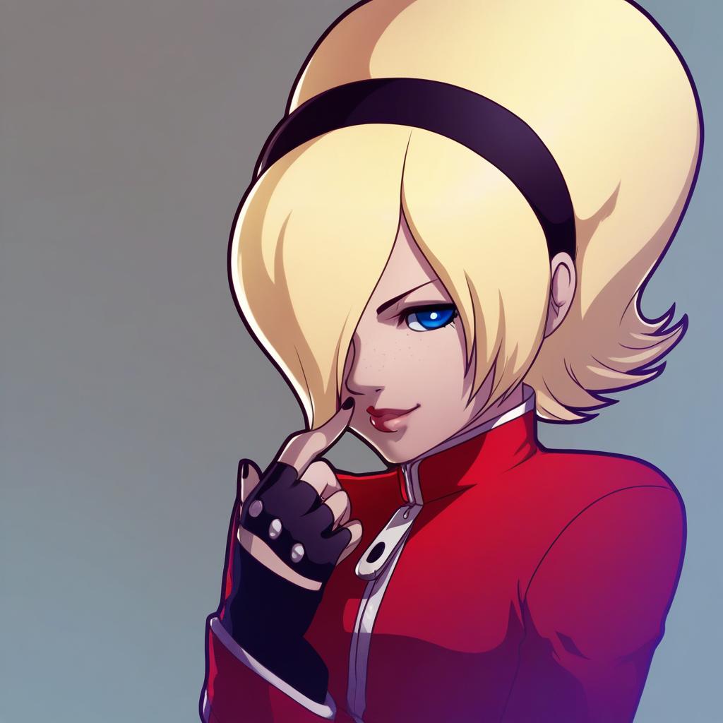 Ash crimson, the king of fighters, 1boy, blue eyes, hair over one eye, blonde hair, hairband, freckles, fingerless gloves, nail polish, black nails, by artist mike inel, leet