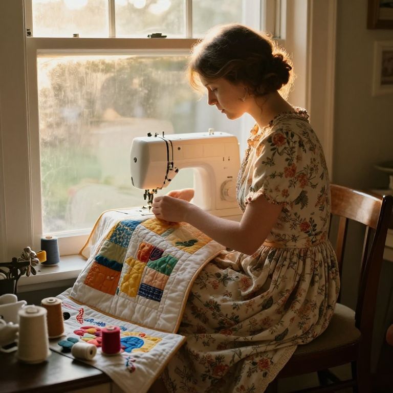 Tradewife sewing by a window, her vintage floral dress softly illuminated by golden hour light, surrounded by sewing materials, cozy and detailed domestic scene with handmade quilts and embroidered linens, warm, calm and nostalgic mood.