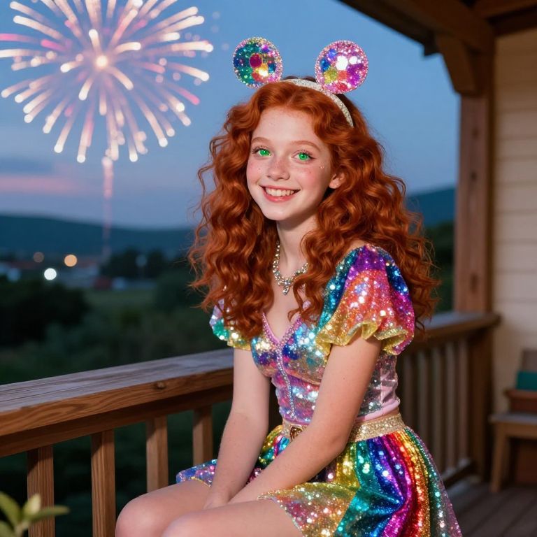 A playful glitter-themed party outfit with rainbow-colored glitter sleeves and a glittery headpiece, worn by a cheerful teenage girl with curly red hair, bright green eyes, and a big smile, sitting on a wooden balcony during a summer evening with fireworks in the sky.