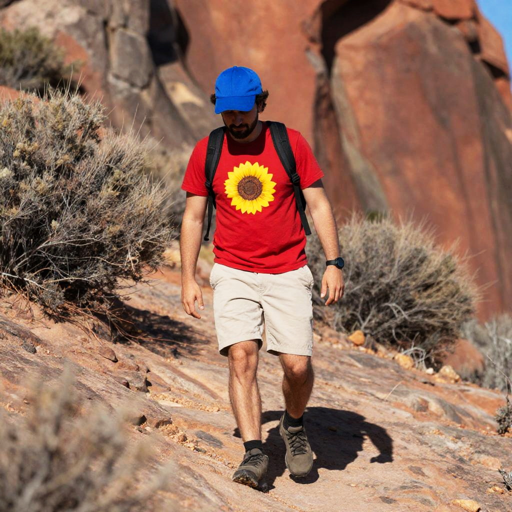Photograph of a muscular man with curly brown hair, wearing a red t-shirt with a sunflower graphic, crawling through a narrow, rocky cave. He looks up with a focused expression, hands gripping a large rock in front of him. Brown rocky walls surround him. A black object is in his right hand.