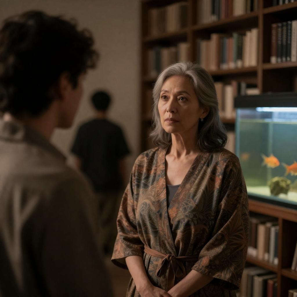 Two people in a dimly lit room. A woman with glasses, gray hair in a bun, wearing a patterned purple robe, stands facing a man with short gray hair, wearing a black coat. She smiles, he looks at her. A painting on the wall, a lamp, and a brown chair are in the background. The man stands to the right, the woman to the left.