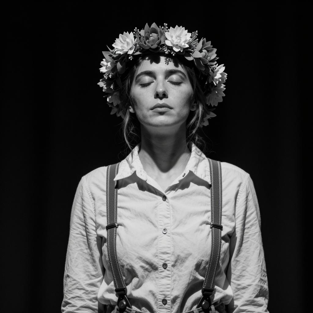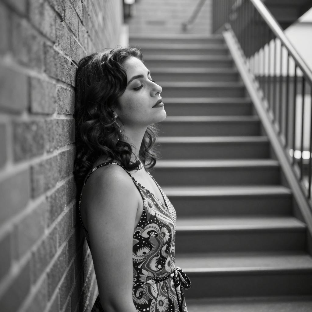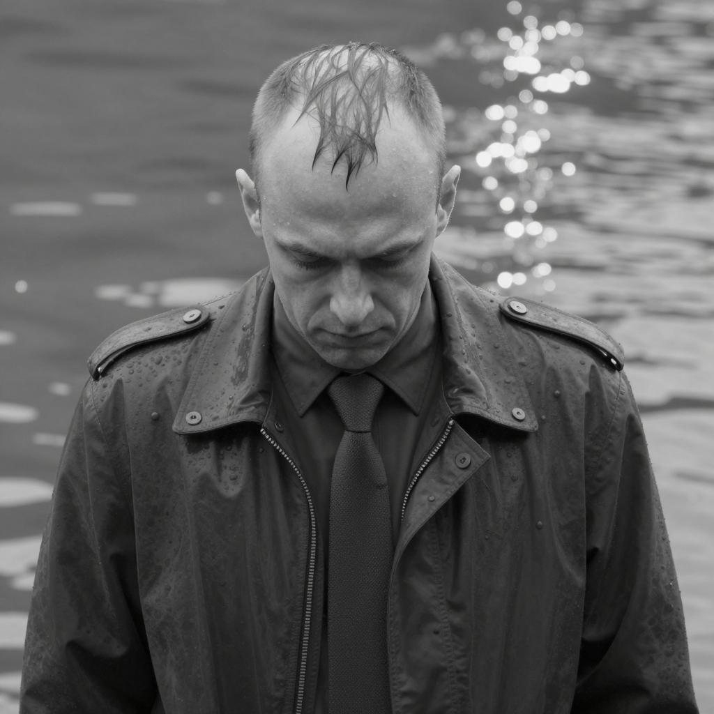 Black-and-white photograph of a woman with wavy blonde hair, wearing a patterned, short-sleeve dress, standing at the edge of a calm lake. She has mud on her face and arms, leaning forward with one arm extended toward the water. Background: still lake surface.