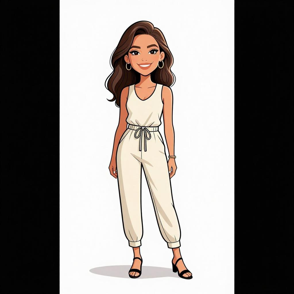 Digital illustration of a smiling woman with long brown hair, wearing a white sleeveless jumpsuit, black sandals, and hoop earrings, standing on a white