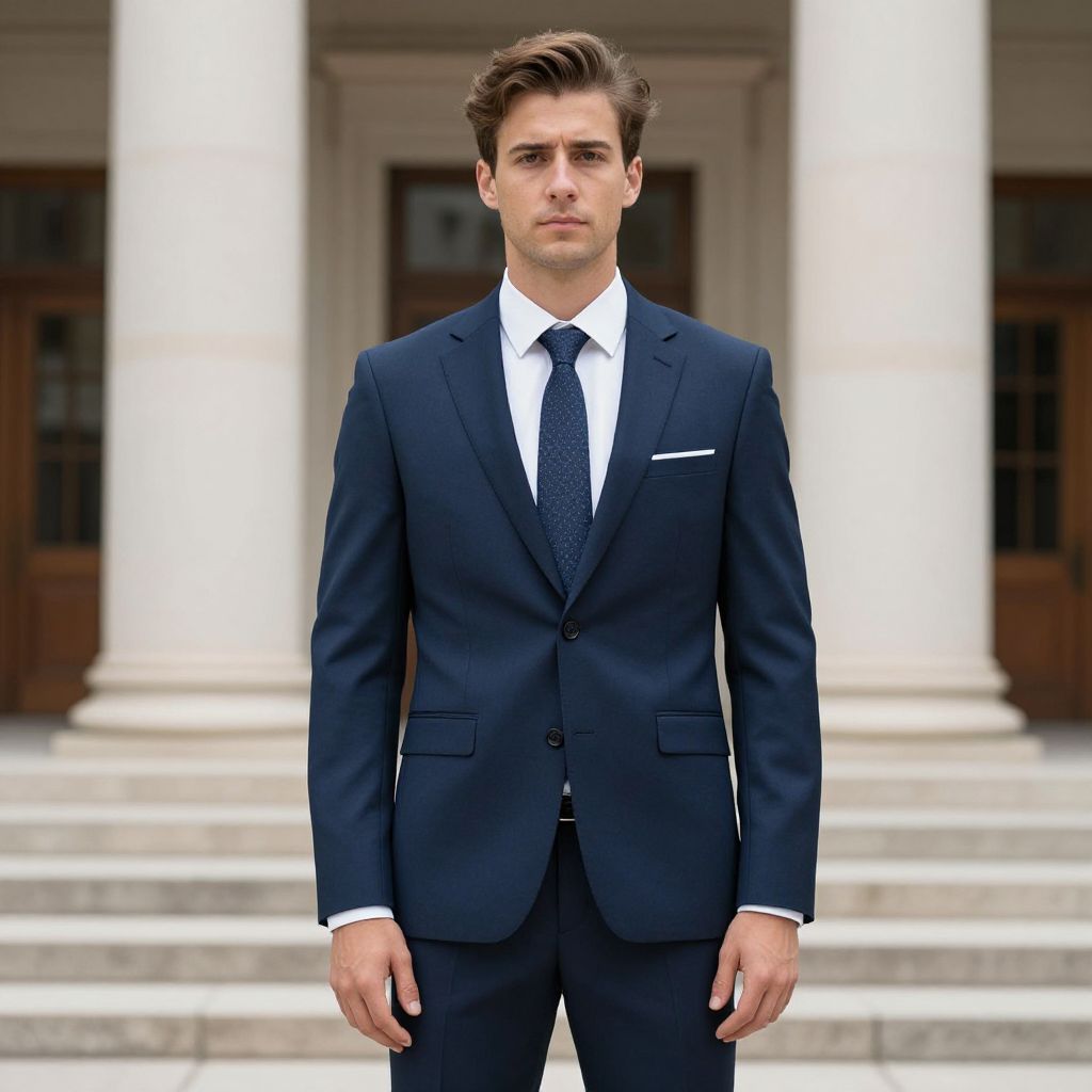 Photograph of a young Caucasian man with short, dark brown hair, standing in front of a grand building with white columns and steps. He is wearing a dark navy blue, well-fitted suit with a white dress shirt and a dark blue patterned tie. His expression is serious and slightly stern. The background features the building's entrance, with wooden doors and windows visible. The lighting is natural, highlighting the man's formal attire and the architectural details of the building. The image has a crisp, clean, and professional style.