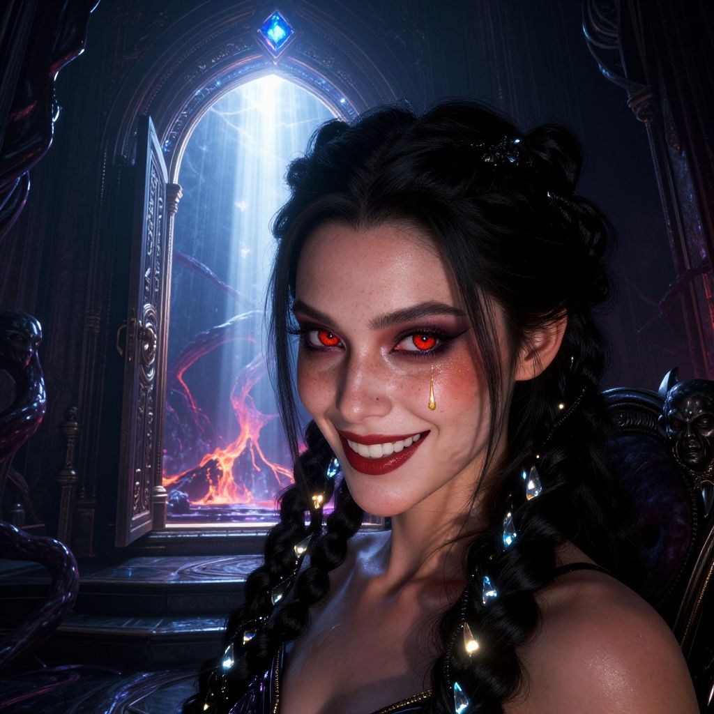 (((full body:3))), a soul eater basking in a beam of celestial light piercing through a dark and gloomy room in the warlock's castle. Behind her, a portal shimmers, its arch glowing with sapphires and engraved silver runes. The portal door stands open, revealing a glimpse of a sultry, volcanic hell-scape. Eerie tendrils of darkness and liquid metal snake from the portal, adding to the unsettling atmosphere.black hair:1, Playful shadows dance across the soul eater's face, highlighting a dusting of sun-kissed freckles and iridescent party makeup. A single teardrop of molten gold traces a path down her cheek. Her majestic braids, woven with strands of obsidian and imbued with an inner glow, cascade down her back. Incredibly detailed close-up, focus on a mischievous grin that hints at both playful cruelty and undeniable charisma. Her piercing eyes, like pools of molten ruby, radiate an otherworldly allure. Casting seat, adorned with demonic visages and crafted from obsidian, hints at her power.futuristic, scifi, intricate, elegant, majestic, Masterpiece;highly detailed; extreme, octane render, zbrush, blender, 3d, post-processing, HDR; lightning; volumetric; cinematic; ray tracing; RTX;radiant light rays, subsurface scattering, soft edge lighting, realistic shadows; vibrant colors, high-res, 8k, 16k, 32k