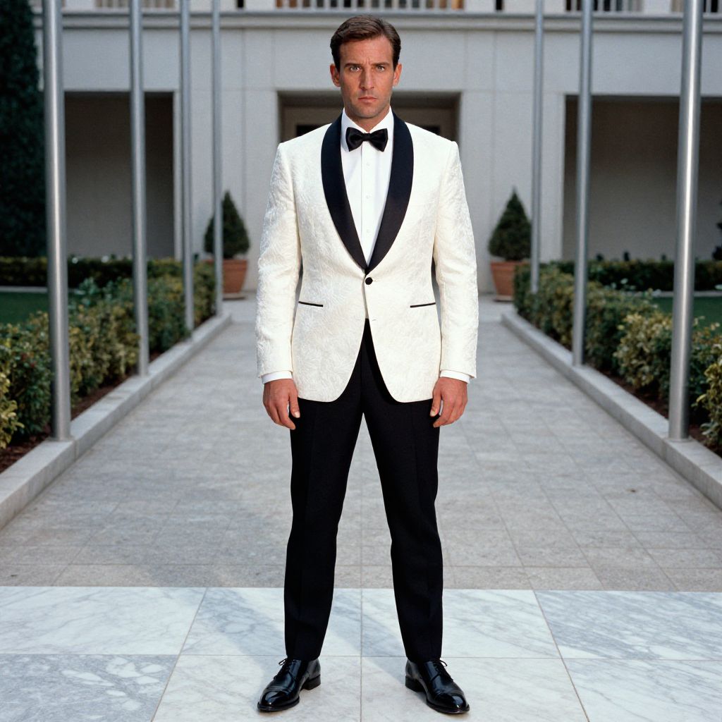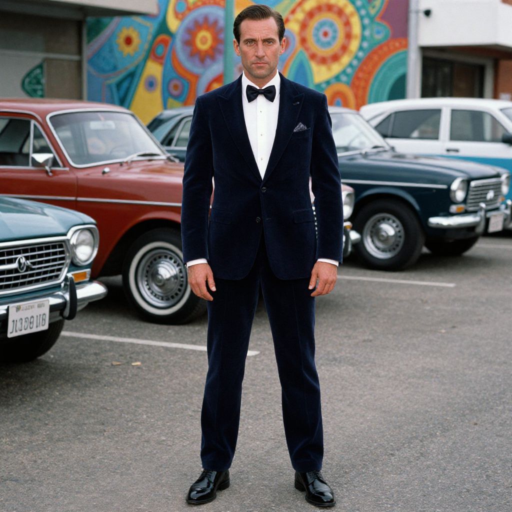 A man, tailored navy velvet suit, crisp white dress shirt, silk black bow tie, polished black leather shoes, subtle pocket square detail, outdoor lot with vintage cars, technicolor analog film stock, confident expression, vibrant murals in the background. Man has masculine face and piercing eyes