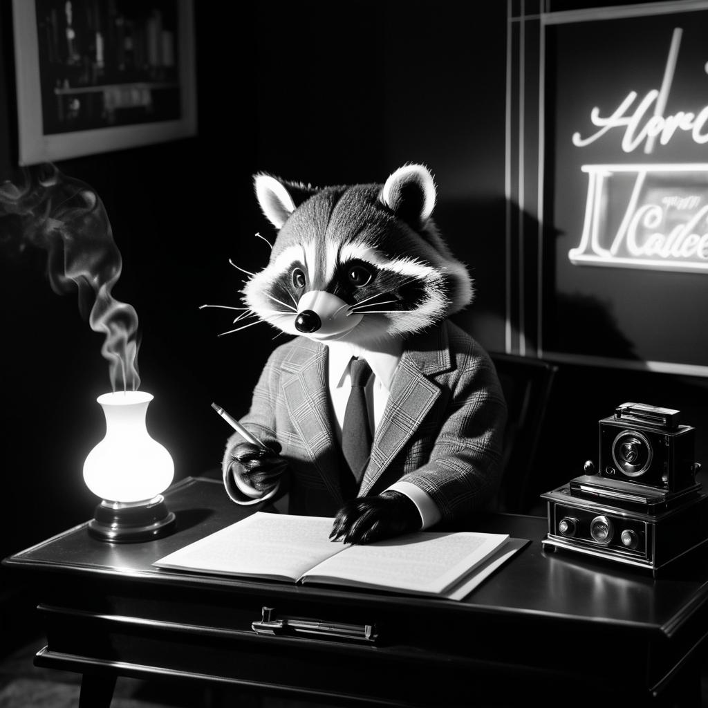A raccoon writing a bestseller on a 1950s television, smoking in a dark noir room. Black and white, 1920s aesthetic, soft table lamp lighting, detailed film grain.