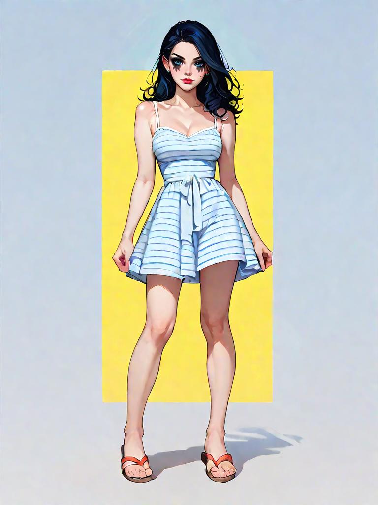 1girl, source_comics, realistic face, full body shot, Woman, casual summer style, striped sundress in pastel colors, thin spaghetti straps, straight neckline, short hemline, relaxed fit, paired with strappy flat sandals, minimalist makeup, indoor boutique setting.