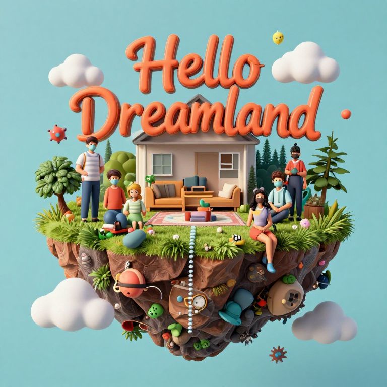 Whimsical digital illustration of a floating island with diverse family members, "Hello Dreamland" text, colorful clouds, trees, and scattered objects.