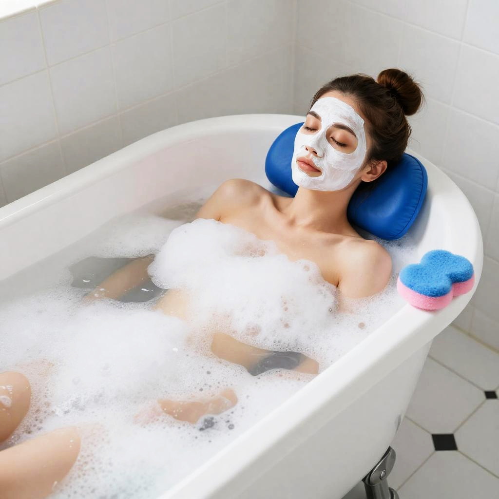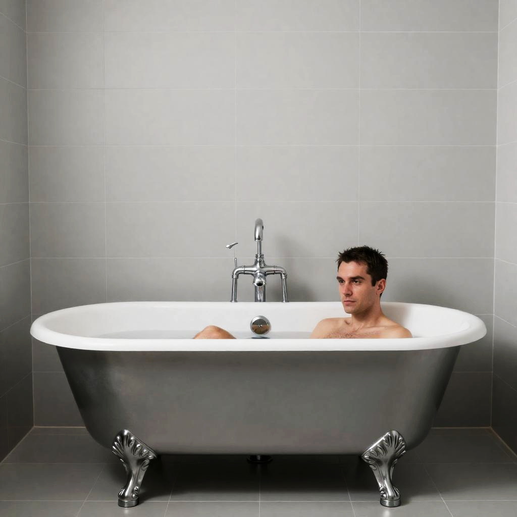 Photograph of a man in a large, metallic, clawfoot bathtub in a minimalist, tiled bathroom. Man's face visible above water, looking slightly to the side, with short dark hair. Grey tiled walls and floor. Metal faucet in center of tub. Man's expression is neutral. Bath center frame, background plain tiles.