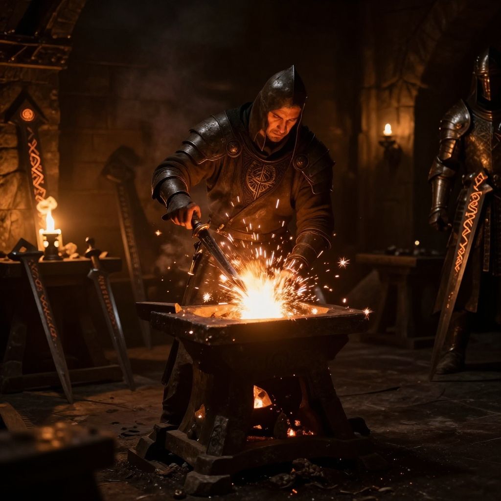 Fantasy guild forge scene at night, master blacksmith crafting enchanted weapons with sparks flying, mystical runes glowing on armor pieces, strong warm lighting against dark stone walls, heroic atmosphere