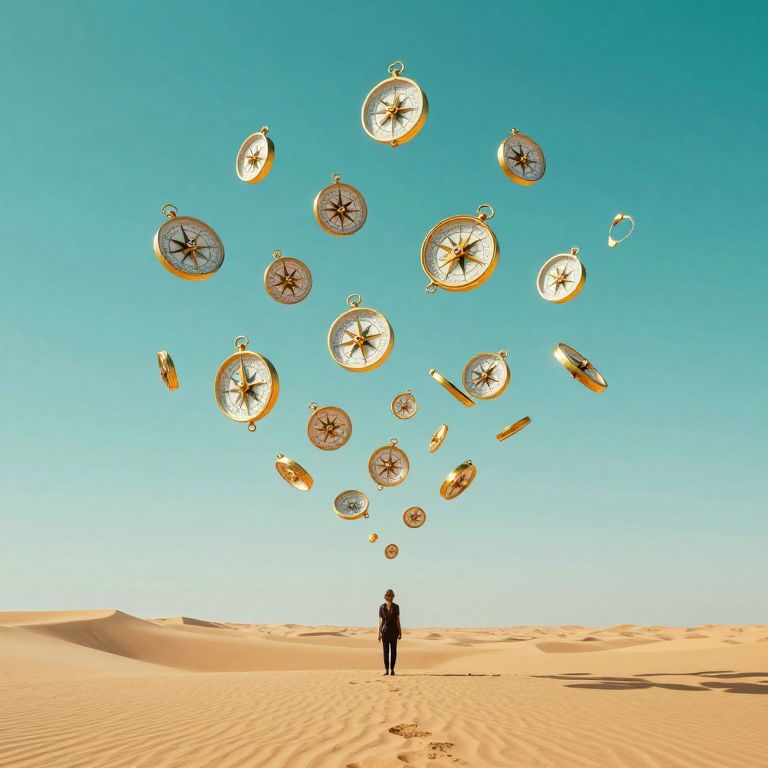In a surreal digital art rendering, a lone figure stands amidst a vast desert landscape as countless golden compasses float and spin in unison against a vibrant teal sky, evoking a whimsical and dreamlike atmosphere where emotion guides their chaotic dance.