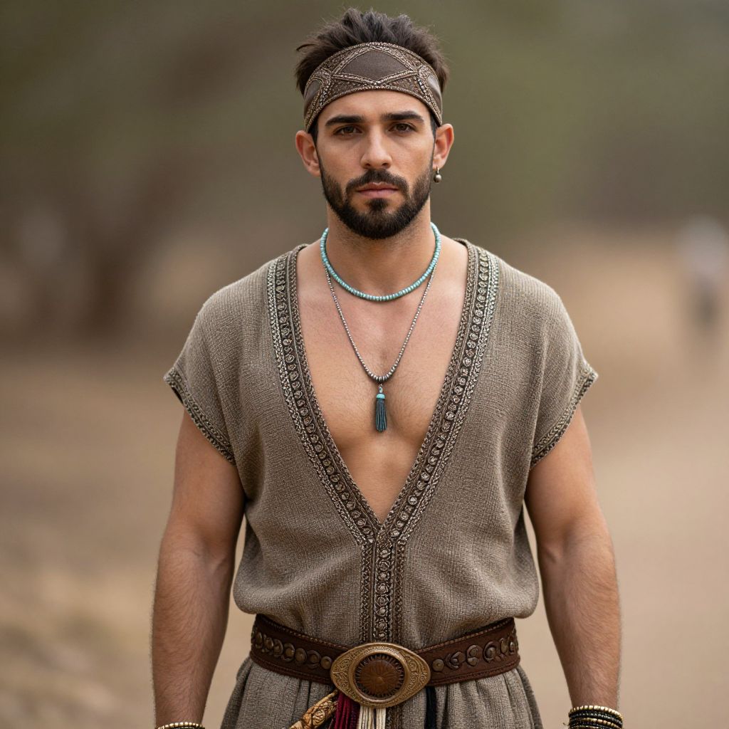 Photograph of a bearded man with medium-dark skin and dark hair, wearing a brown headband and a deep V-neck, short-sleeved, textured tunic. He has a muscular build and is adorned with a turquoise necklace, matching bracelet, and a dog tag necklace. His tunic is belted with a dark leather strap featuring a circular, ornate buckle. The background is blurred, featuring earthy tones and indistinct trees, suggesting an outdoor, natural setting. The man's expression is serious, and he stands facing the camera. The image has a slightly surreal, hyper-realistic style.